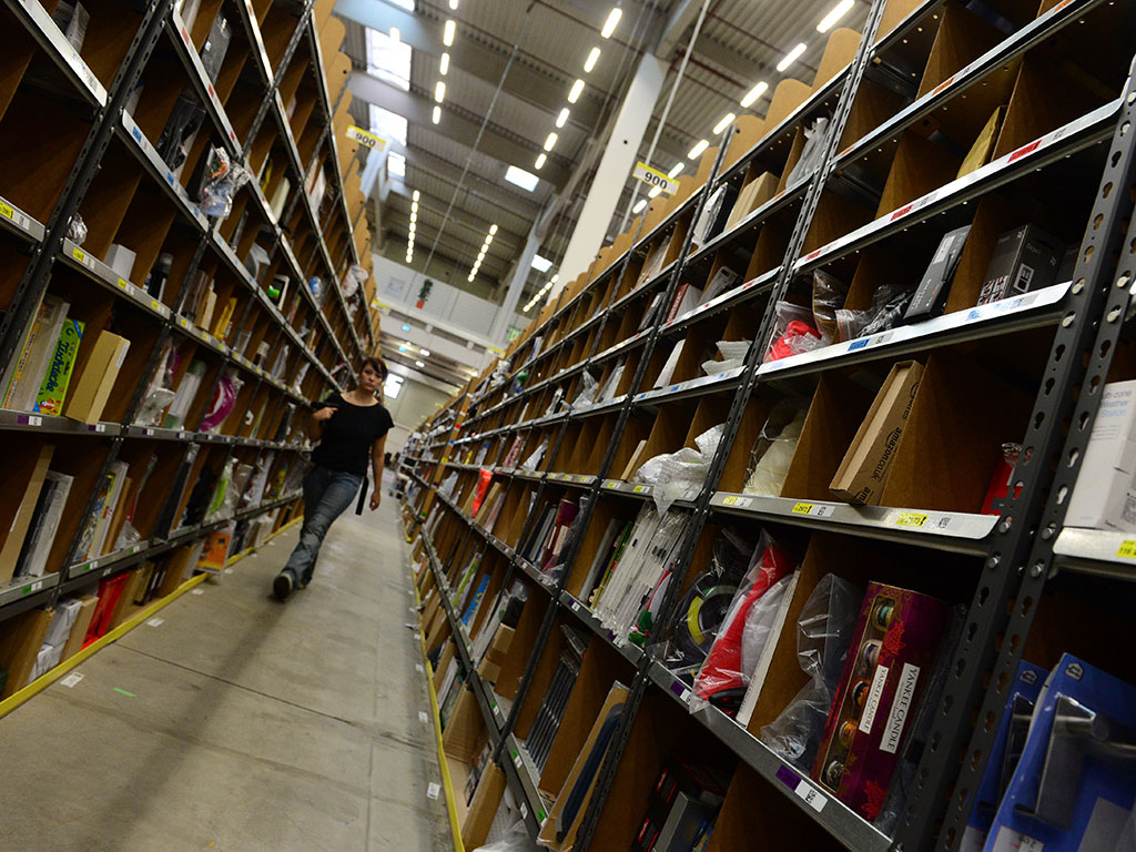 A worker walks between shelves at one of Amazon's vast warehouses. The online giant has begun offering interest-free loans to UK customers, threatening the higher-end business of rivals