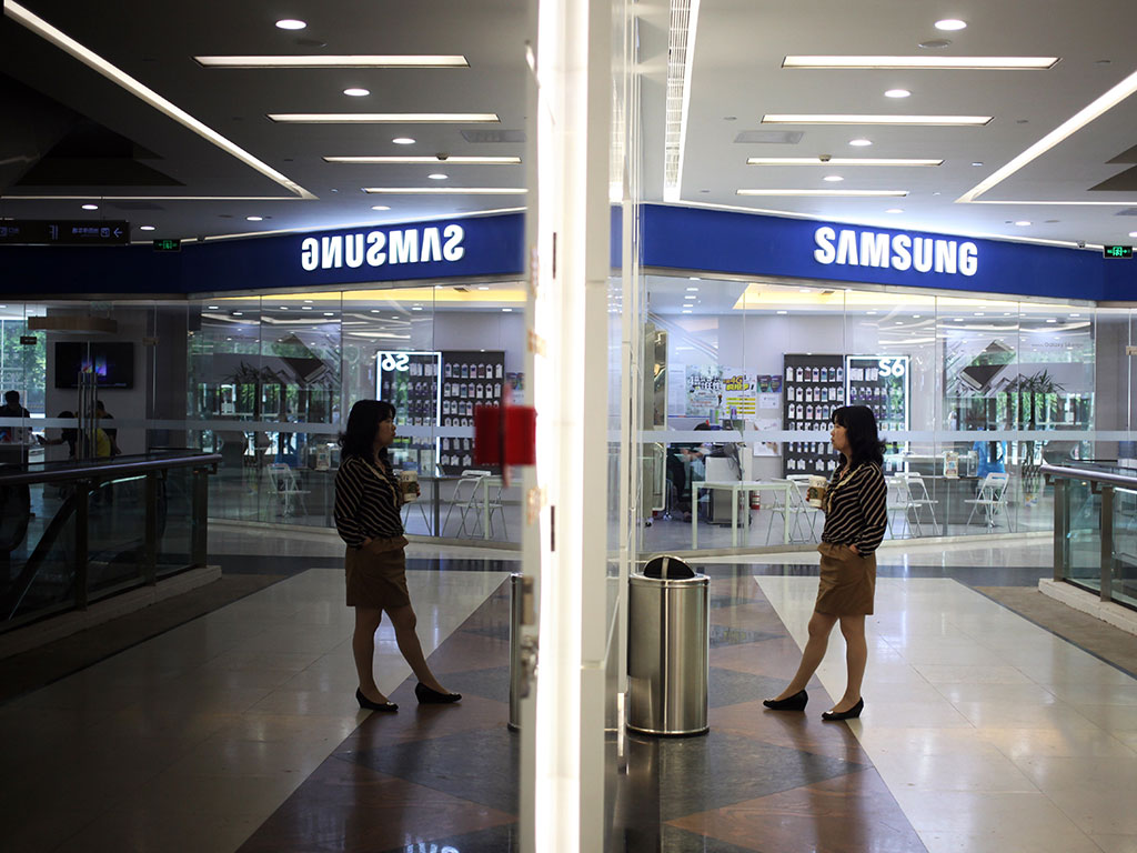 A woman waits for a lift outside a Samsung store in Beijing. The South Korean mobile phone firm has been squeezed in China by both higher-end iPhones and cheaper domestic brands
