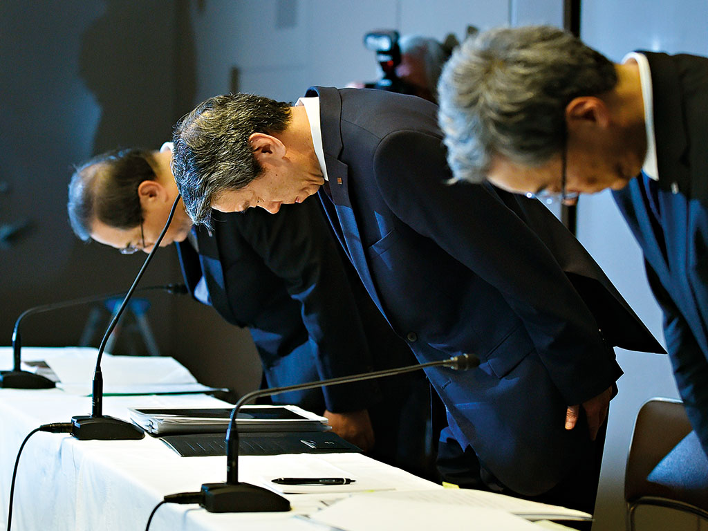 Toshiba executives at a press conference in July. The company was recently involved in an accounting scandal