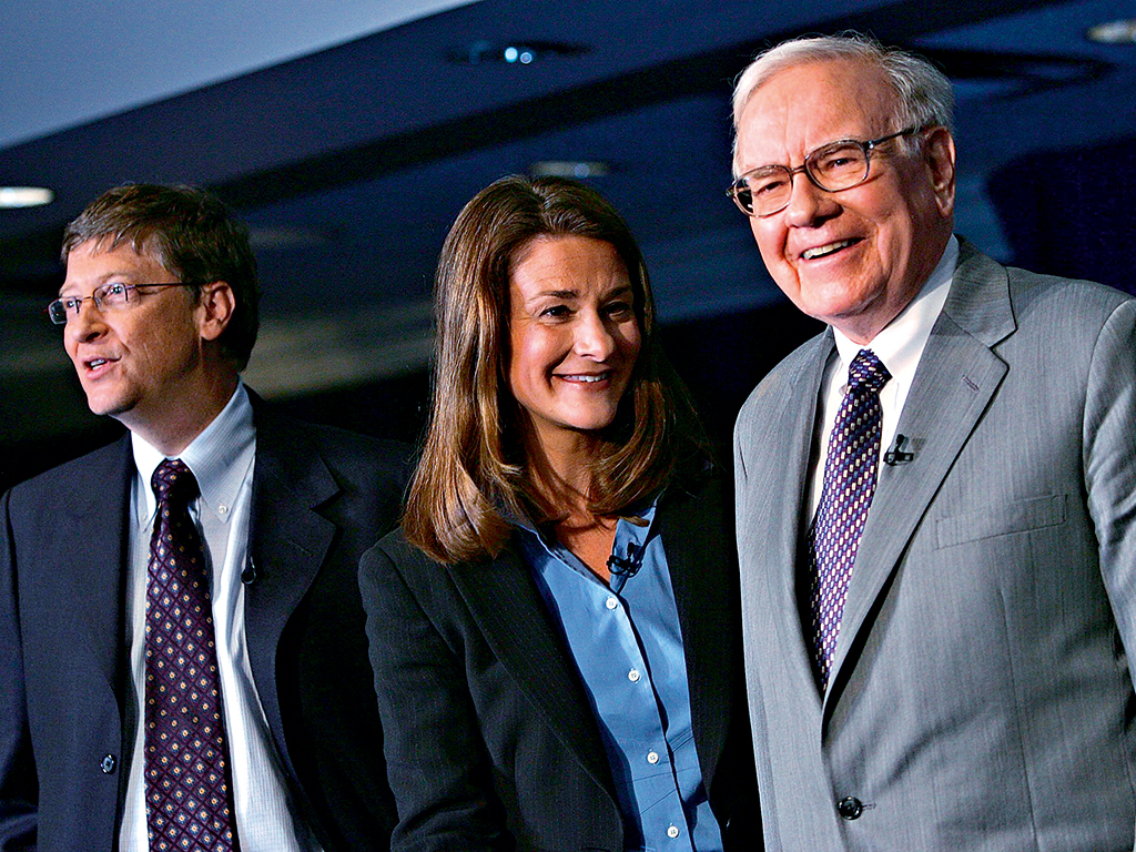 Warren Buffett (r) stands with Bill and Melinda Gates at a news conference where Buffett spoke about his financial gift to the Bill & Melinda Gates Foundation
