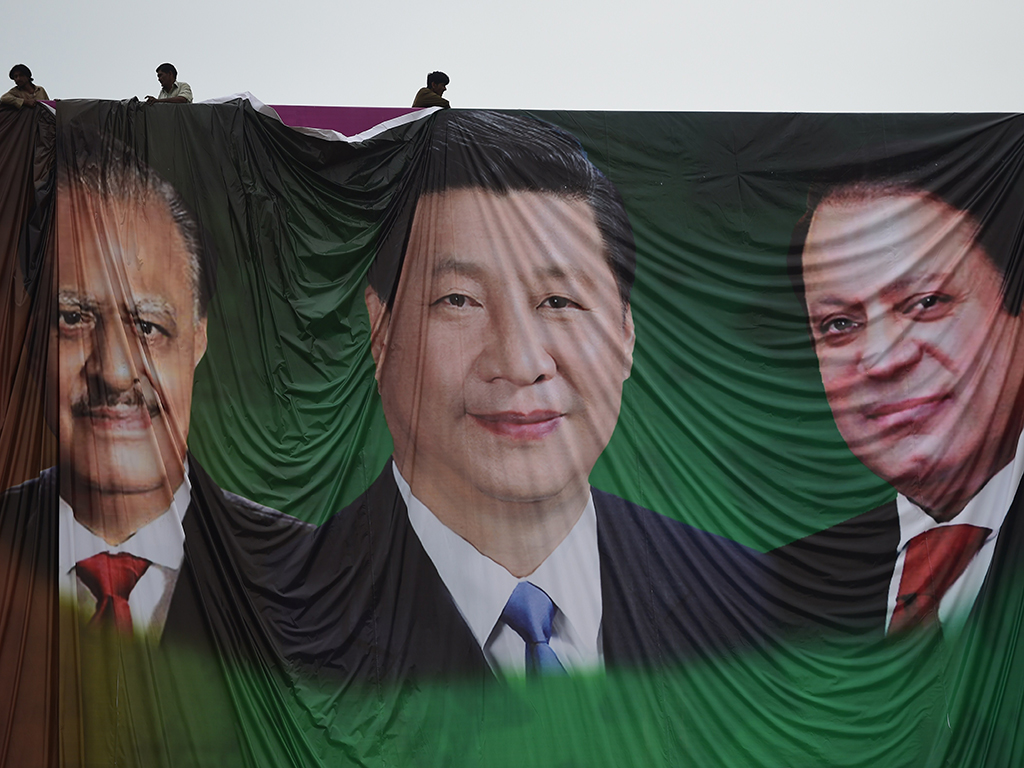 A welcoming billboard is put up for China, featuring President Xi Jinping, his Pakistani counterpart Mamnoon Hussain (l) and Prime Minister Nawaz Sharif. The countries hope the new economic pipeline being build with improve international relations and economic prospects