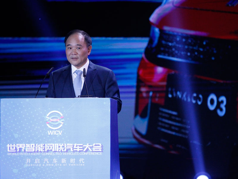 Li Shufu, chairman of Geely speaks during the opening ceremony of the 2018 China International Energy-Saving and New Energy Vehicles Exhibition