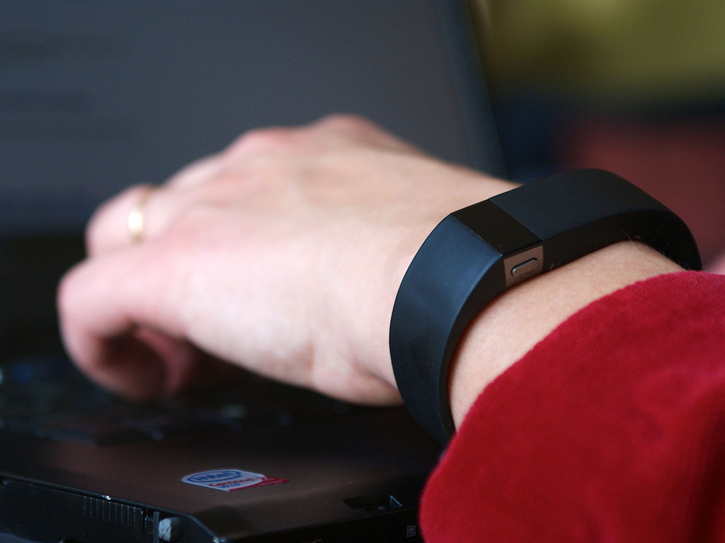 Someone wears Fitbit wearable tech while working on a laptop. The company could fetch around $358m if valuations for its IPO are correct