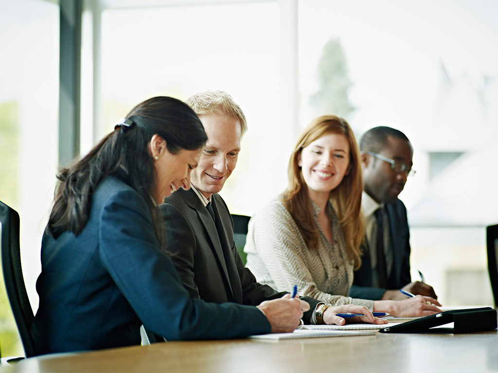 Men and women discuss meeting notes in boardroom