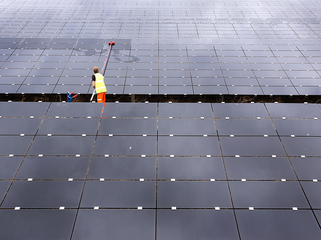 Panels are cleaned at Landmead Solar Farm in Oxfordshire. Only a small percentage of the solar panels installed in the UK are made there, meaning EU import tariffs hurt the national industry.