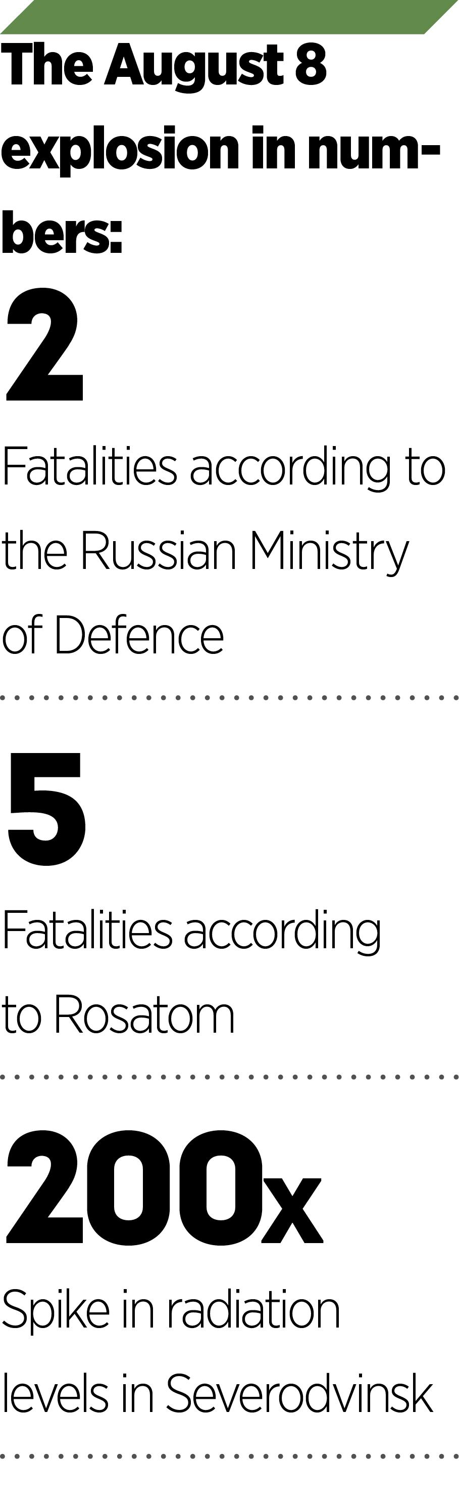 Explanations from Moscow were characteristically vague. Initially, the Russian Ministry of Defence declared that a fire caused by an explosion of a liquid-fuelled rocket engine had killed two individuals and injured four others. It also stated that background radiation remained at normal levels. However, local authorities in the city of Severodvinsk, some 25 miles away from where the explosion took place, provided contrasting information: they saw a spike in radiation levels 200 times that usually recorded.