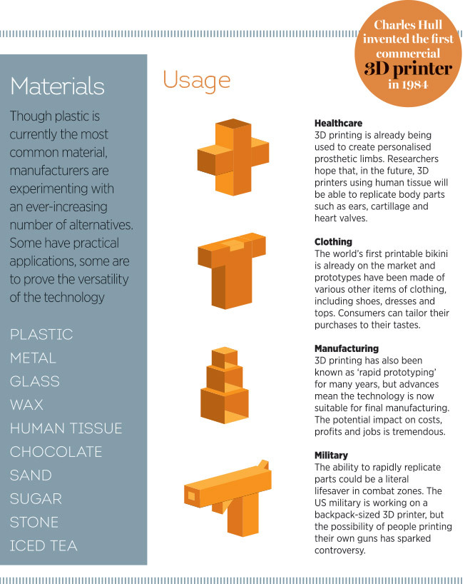 Of course, it’s not a printer at all. In fact, the technology produces a three dimensional object from a digital model by layering microscopic layers of plastic, resin or metal. The printer itself is essentially a gantry that allows a depositor to travel around 3D space, creating objects. In the future, as this technology is developed, it might well prove useful in some precision technology industries where the human hand is just not steady enough: but reports of its wider usefulness have been greatly exaggerated.