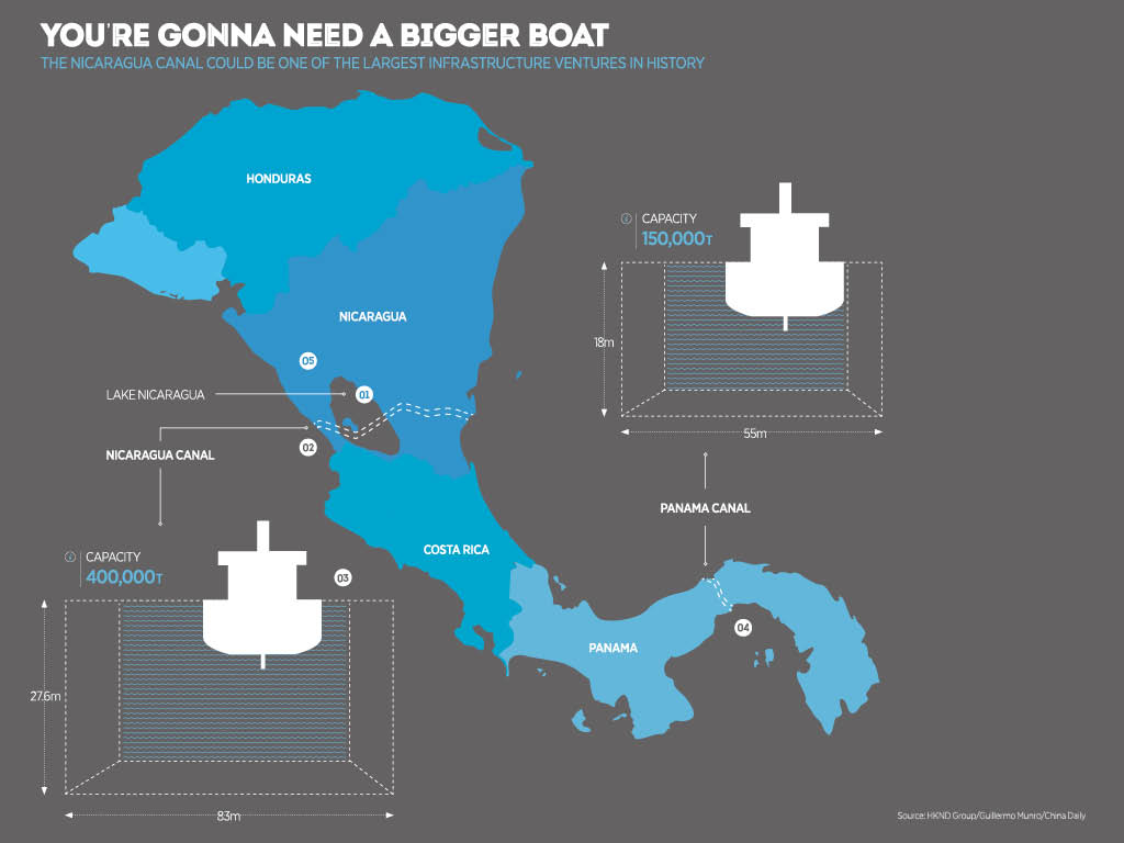 With a capacity of 400,000 tons and a depth of 27.6 metres, the canal is set to become one of the biggest infrastructure projects of all time. It will provide passage for vessels too large for the Panama Canal.