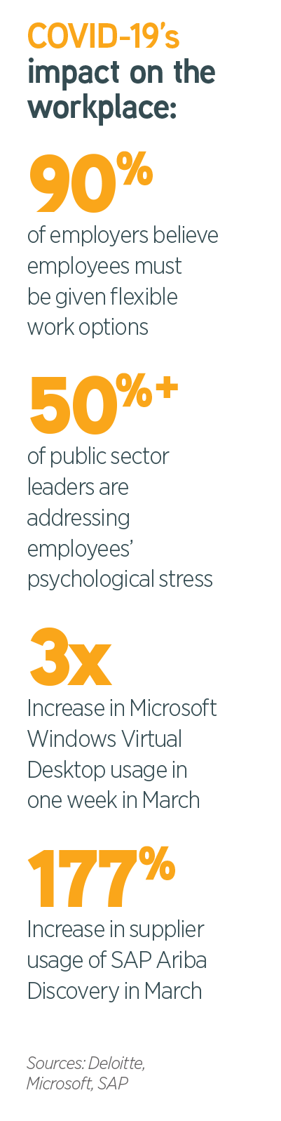 With this in mind, organisations need to help employees regain some sense of control to help them be productive. According to a Deloitte survey that was conducted during the COVID-19 outbreak, 90 percent of employers believe it is urgent to provide employees with remote and flexible work options, while more than half of government and public service entities are focusing on addressing employees’ psychological stress.