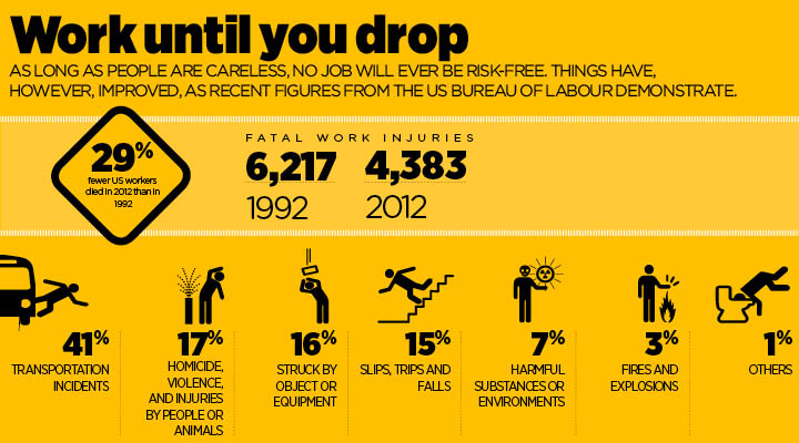 Workplace fatalities in the US are decreasing, according to the Bureau of Labor. However, this is not cause to be complacent – accidents at work can still be deadly. As this infograpic illustrates, there were more than 4,000 work-related fatalities in 2012. Causes ranged from transportation incidents and homicide to slips and fires.